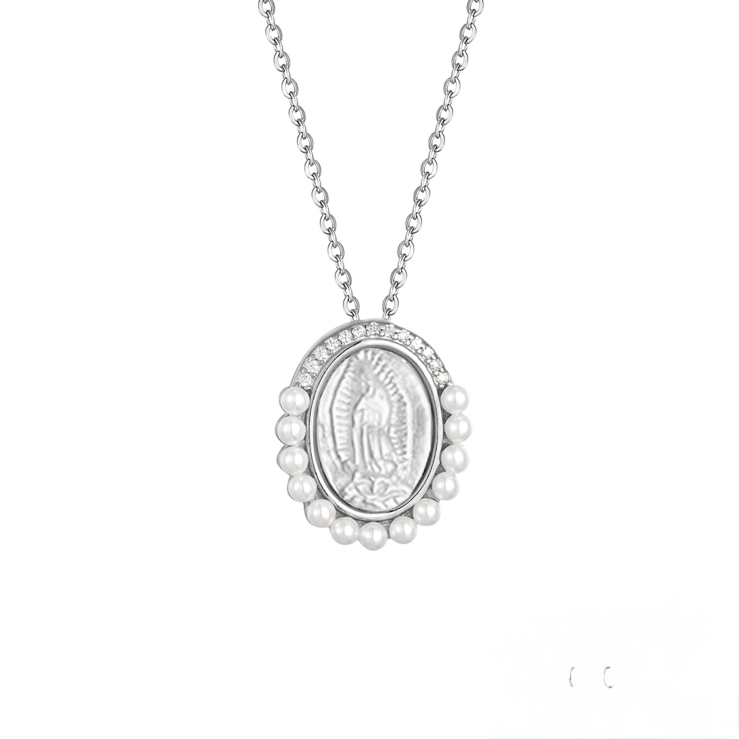Cadena de plata, circones, perlas y madre perla. 16-18 pulgadas