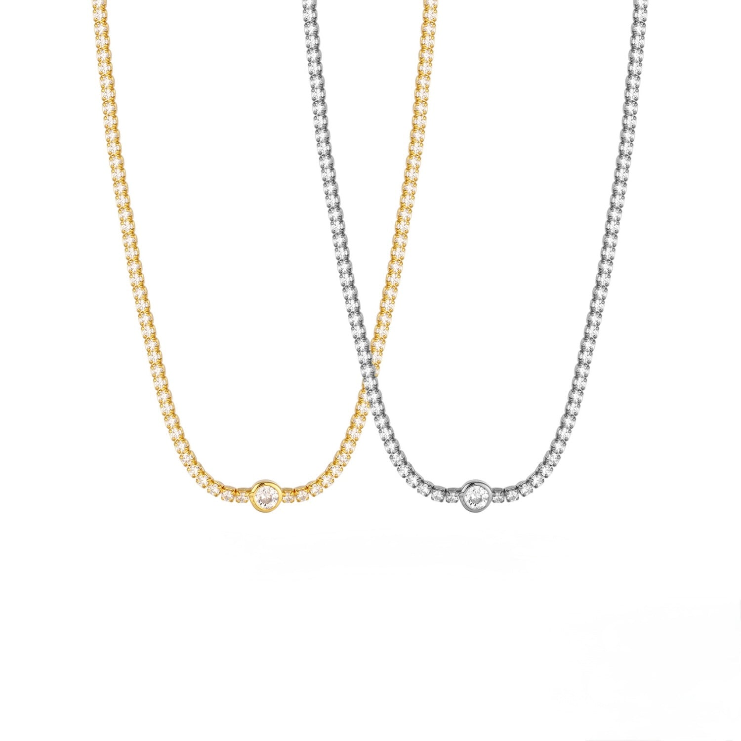 Cadena chocker de plata con baño de oro y circones. Largo 12.5-14.5 pulgadas.